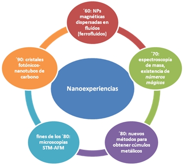 En 1960 Richard Feynman presentó una conferencia visionaria y profética "There is plenty of room at the bottom" (Hay bastante espacio en el fondo) en una reunión de la Sociedad Americana de Física en la que especuló sobre las posibilidades y potencialidades de los materiales nanométricos. Él concibió la formación de líneas a relieve de unos pocos átomos de ancho con haces de electrones, prediciendo así la litografía de haz electrónico actualmente utilizada para producir chips de silicio. Propuso manipular los átomos individualmente para poder construir pequeñas estructuras que tuvieran las propiedades más variadas. Sin embargo, no fue el único visionario. Otro físico teórico, Ralph Landauer, quien trabajaba en IBM en 1957 tuvo ideas sobre la electrónica a escala nanométrica y comprendió la importancia que alcanzarían los efectos mecánico-cuánticos en tales dispositivos. Un siglo antes (1857), Michel Faraday publicó un artículo en la revista Philosophical Transactions of the Royal Society en el que trató de explicar cómo las nanopartículas metálicas influyen sobre el color de las ventanas de las iglesia o cómo la famosa copa de Licurgo, utensillo del siglo IV (a.C.) de vidrio de sosa y cal que contiene nanopartículas de oro y plata, varía su color de verde a rojo intenso cuando se le introduce una fuente luminosa en el interior. En el área de la química, se puede mencionar un artículo sobre cúmulos publicado en 1661 por Robert Boyle en Sceptica Chymist en el que él sugiere que pequeñas partículas de materia se combinan de varias maneras para formar lo que se denominó "corpúsculos".