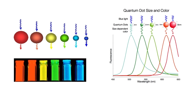 Seis soluciones diferentes de nanocristales (quantum dot) excitadas con una lámpara UV de onda larga absorben luz y luego la emiten en un color diferente; el tamaño del nanocristal (Å) determina el color. A la derecha, se observa el espectro de fluorescencia obtenido a diferentes longitudes de onda (obtenido de http://www.nanosysinc.com) |